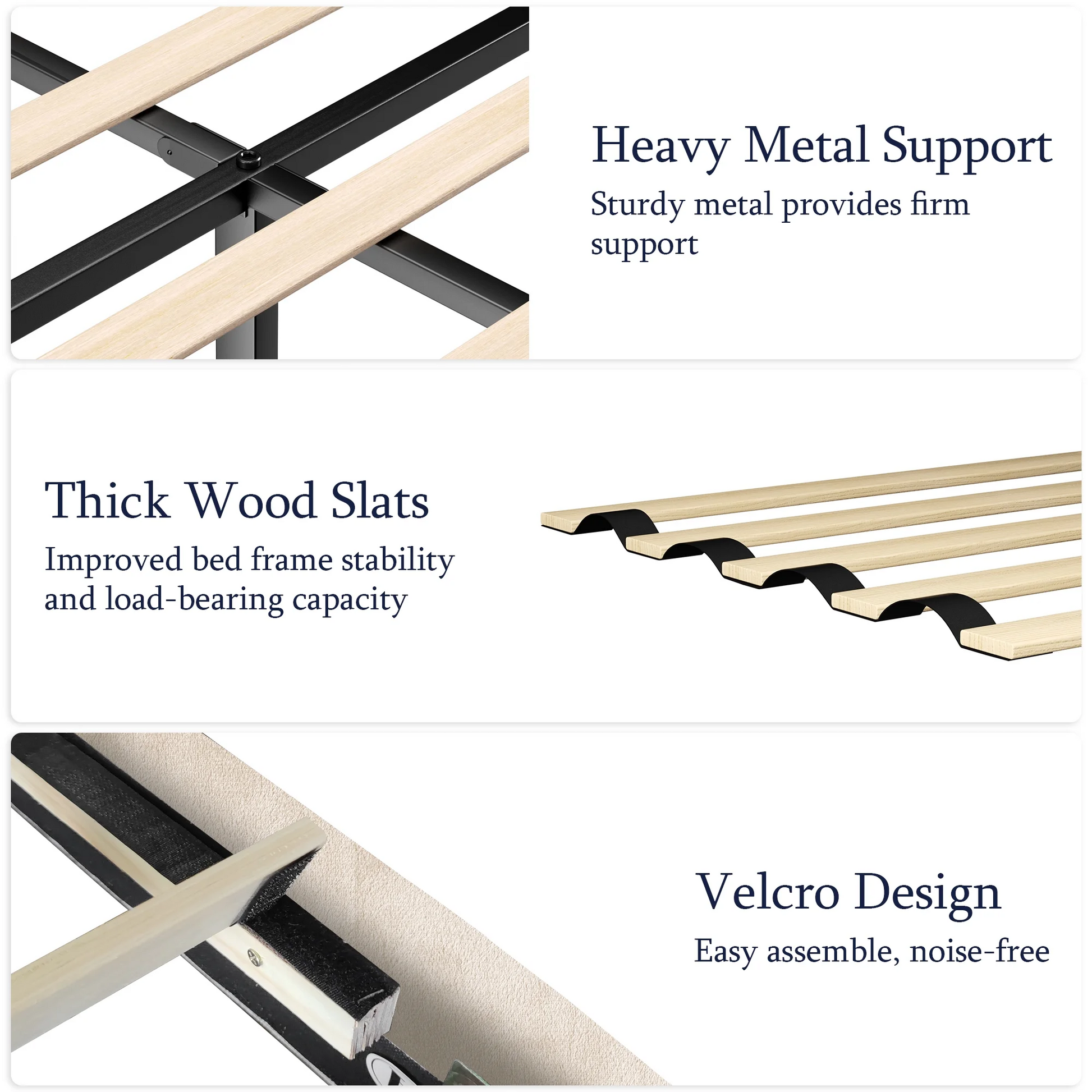 Sturdy and Strong: The king-size platform bed frame is made of high-quality metal with 9 center support legs and evenly spaced slats. This design ensures a sturdy and reliable base that will provide years of lasting support.