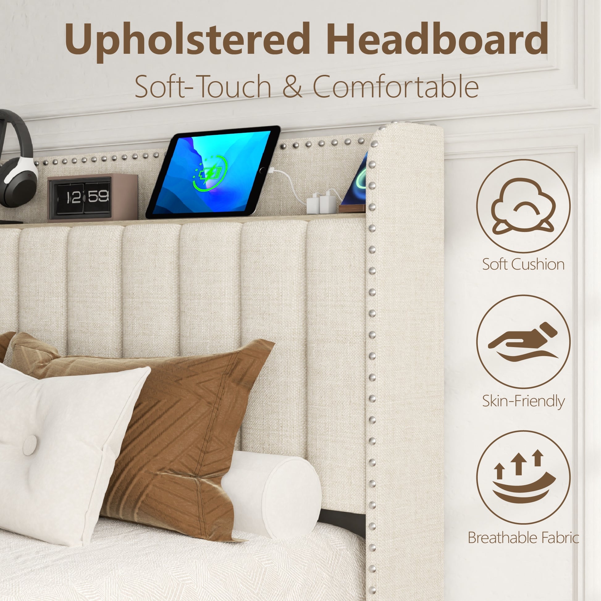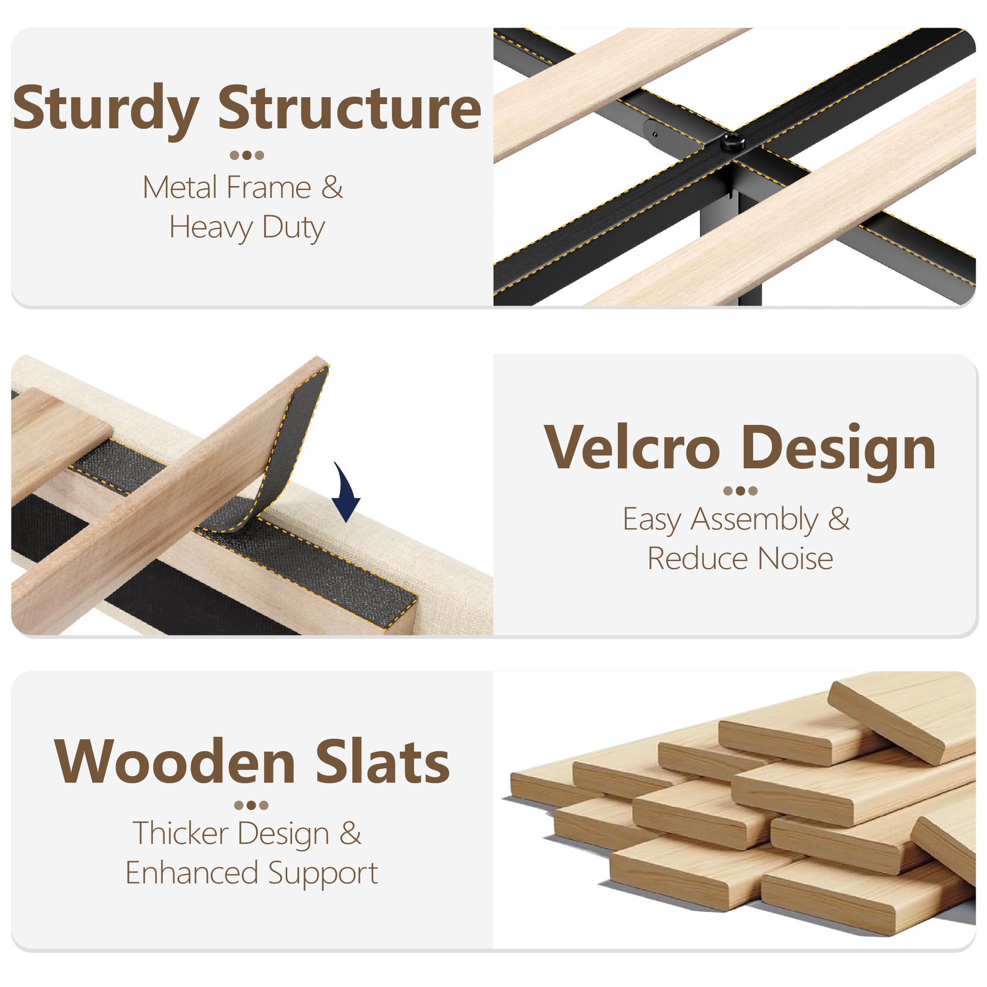 - King Size Bed Frame with Nailhead Trim Design: The headboard of this bed frame is upholstered in high-quality linen fabric that feels soft and skin-friendly. Filled with high-resilience foam, it offers comfortable back support, making it easy to relax while reading or resting. The delicate nailhead trim outlines the edges of the headboard, showcasing fine craftsmanship and adding a touch of vintage charm and elegant details, enhancing the elegance and overall character of your bedroom.