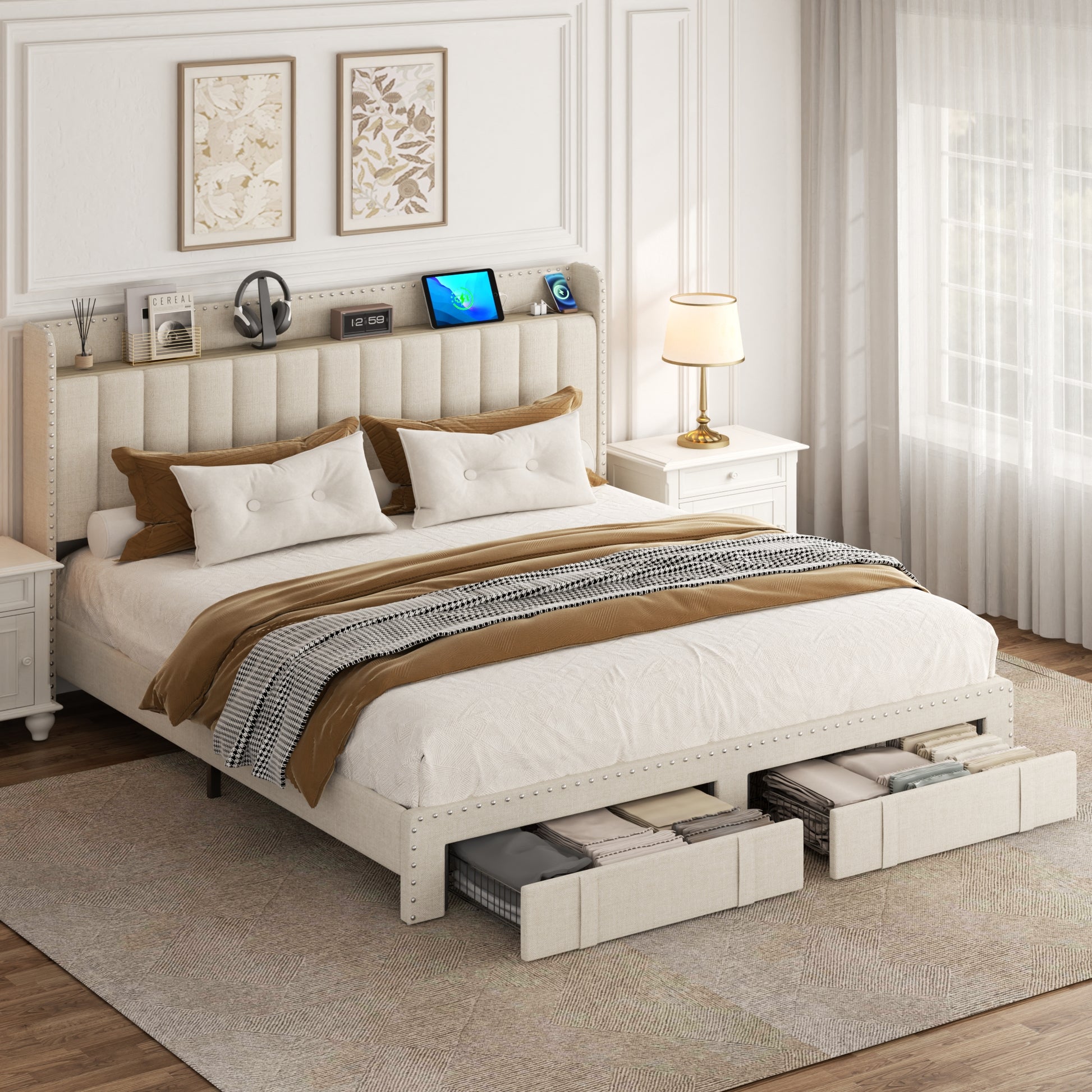 VIPLOV Bed Frame with Headboard and Storage, Platform Bed Frame with 2 Drawers, Upholstered King Size Bed Frame with Storage, Built-in Charging Station, Noiseless